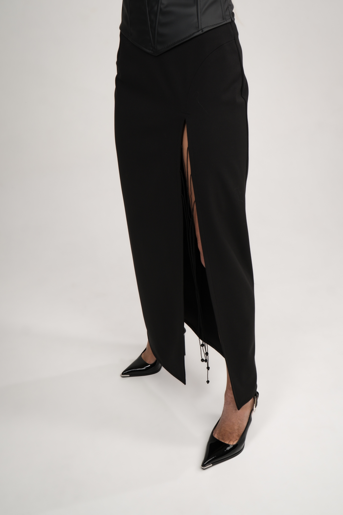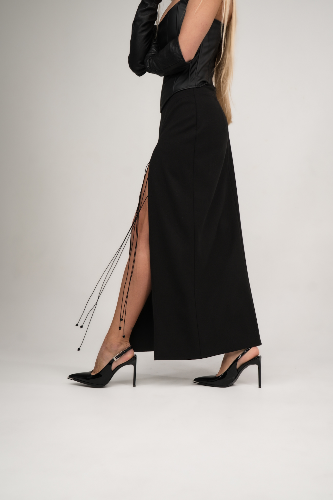 A stunning long black skirt, tailored from a luxurious heavyweight fabric with a graceful drape. Designed with a chic high slit that can be adjusted with delicate ties, this piece combines elegance and versatility. Perfect for both everyday wear and special occasions.