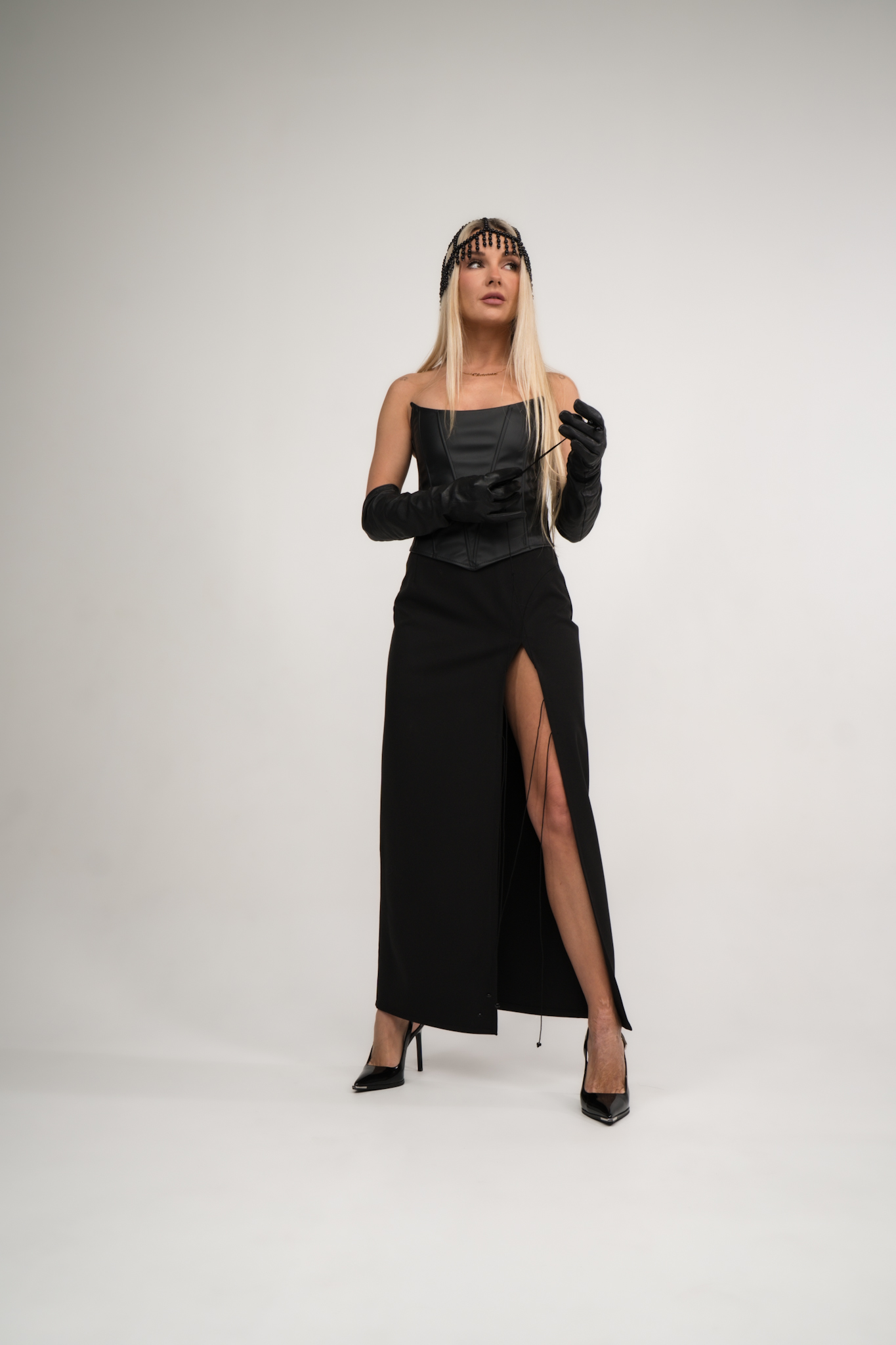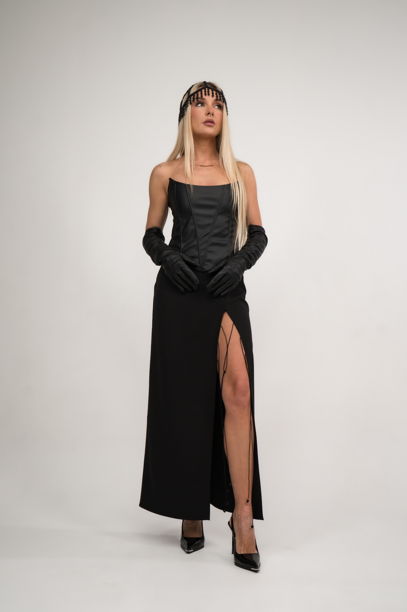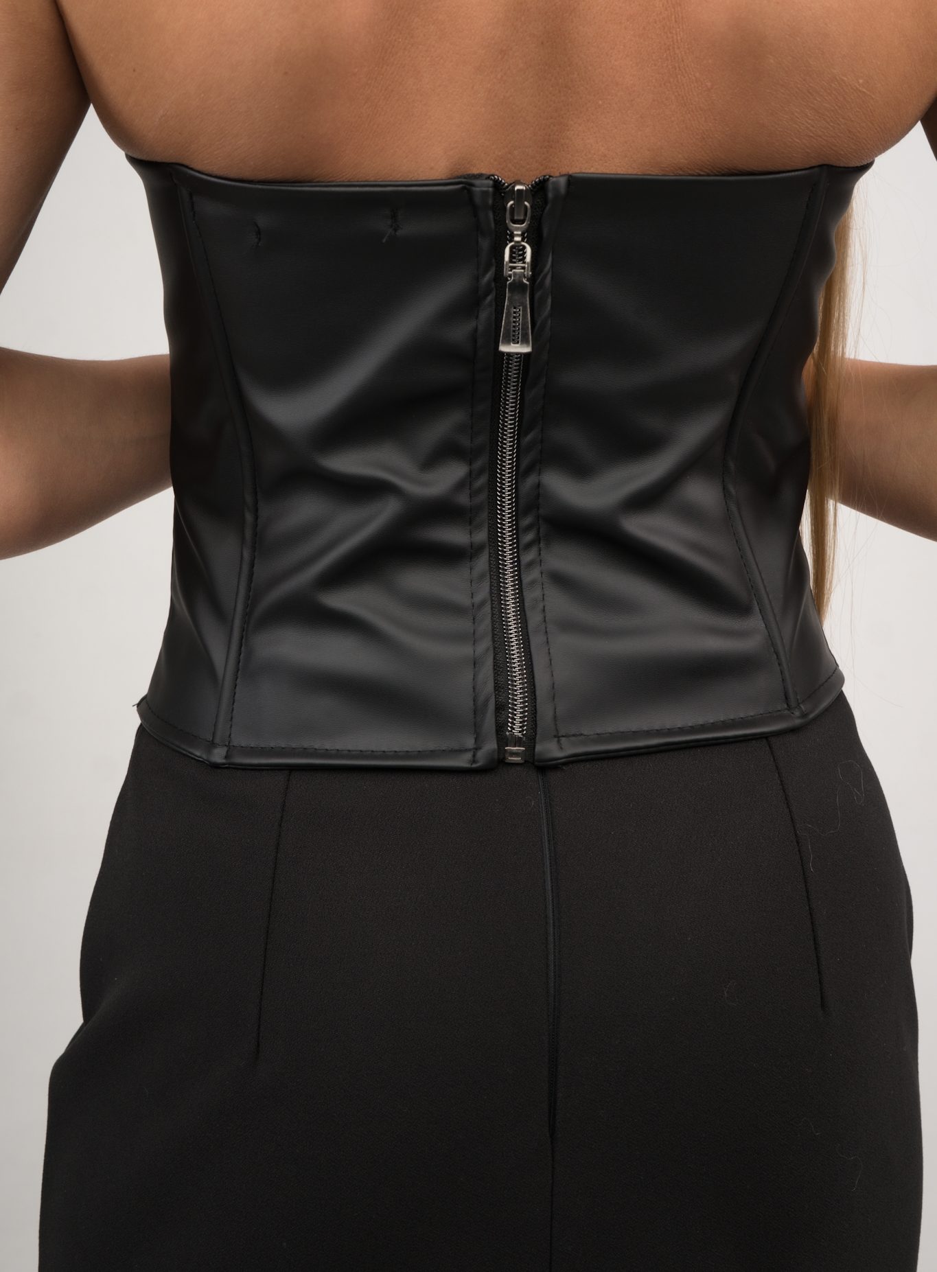 Crafted from soft faux leather, this corset combines structure with comfort. Designed with a zipper closure, it elegantly enhances and defines the silhouette while remaining supple and comfortable to wear. A versatile statement piece, it pairs beautifully with jeans, skirts, or layered over a shirt for a refined and modern look.